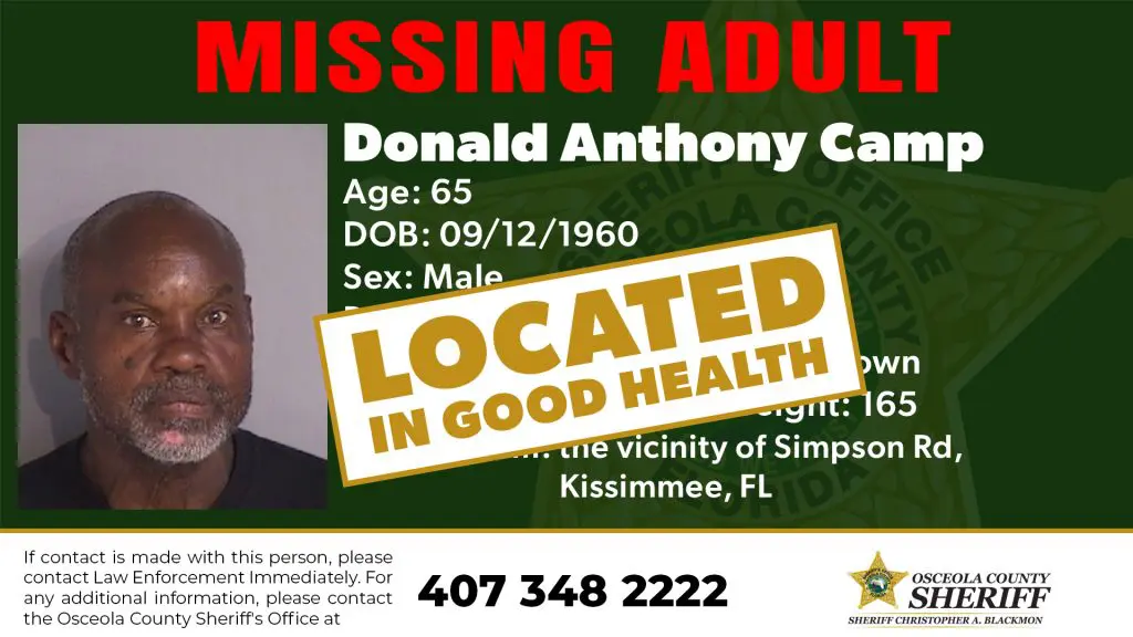 We are pleased to report that Donald Anthony Camp has been located and is in good health.