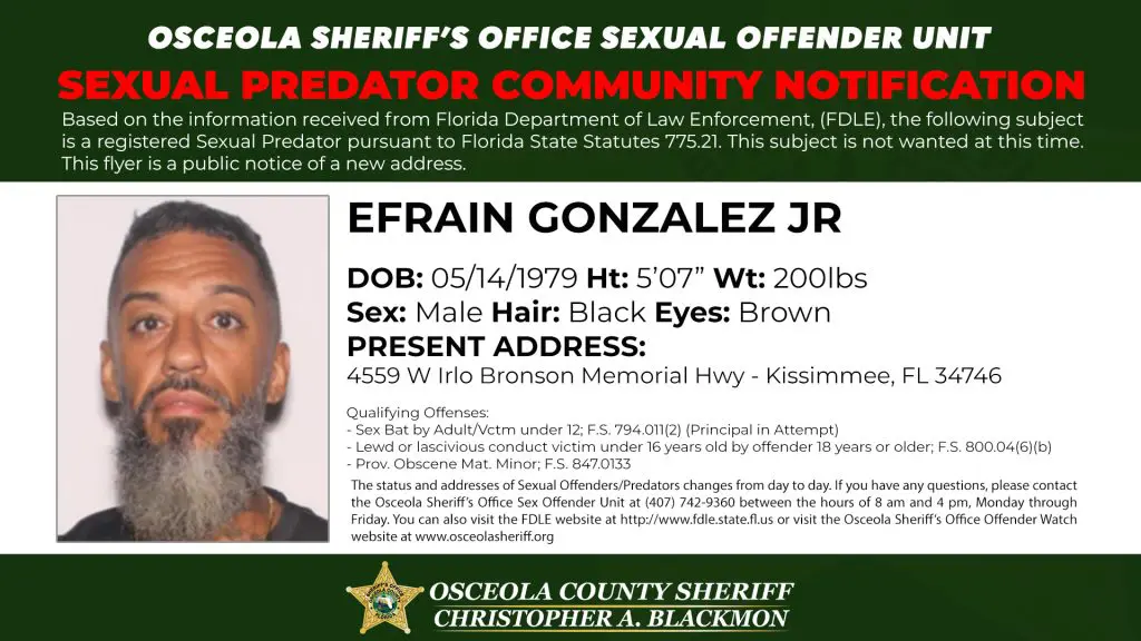 Sexual Predator Community Notification published by the Osceola County Sheriff’s Office informing residents of a registered sexual predator address update