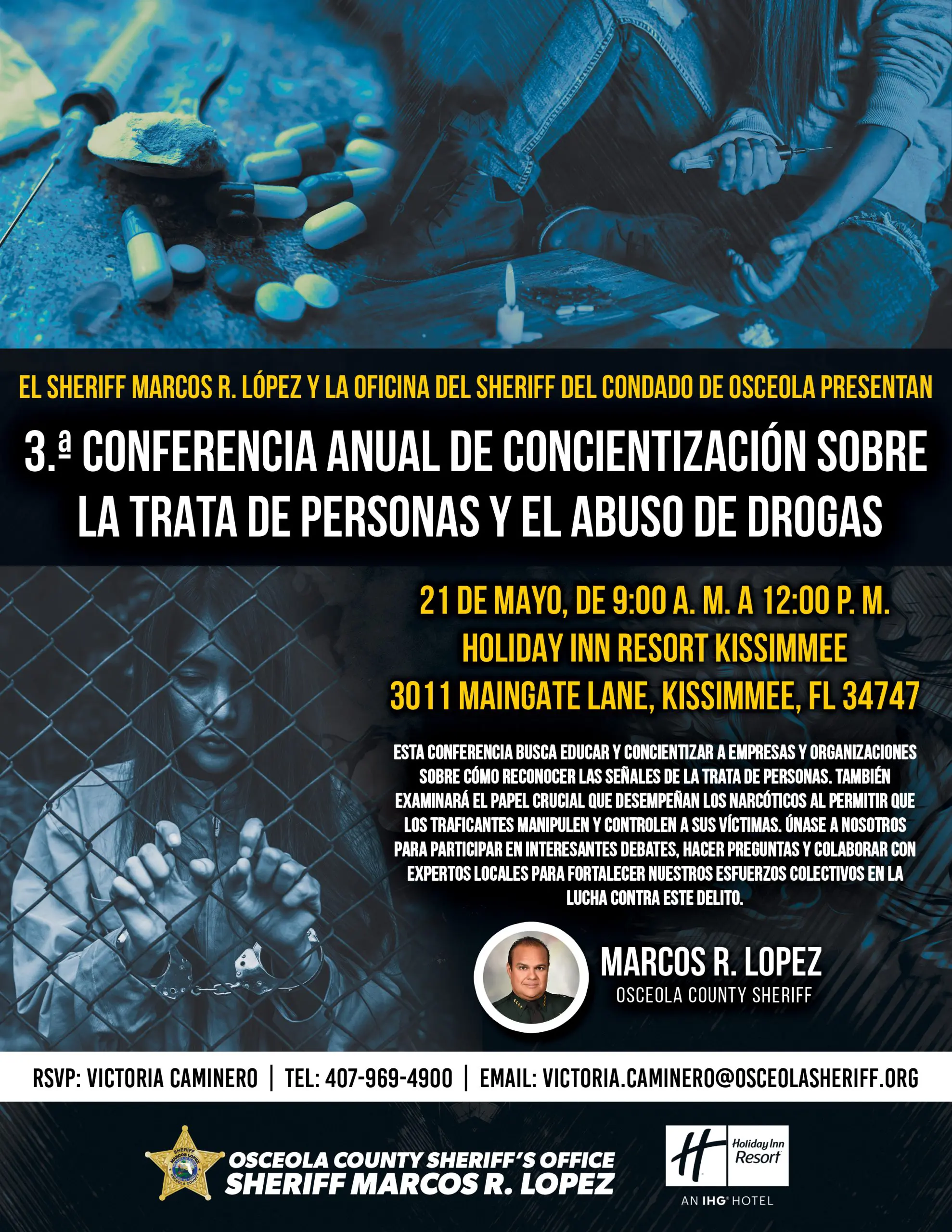 Sheriff Marcos R. Lopez and the Osceola County Sheriff’s Office present the 3rd Human Trafficking and Drug Abuse Awareness Conference. This conference will educate and bring awareness to representatives from the hotel industry on indicators of human trafficking. Also, how narcotics play a substantial role in traffickers controlling their victims, please join us for a conversation, questions, and collaboration with local experts.