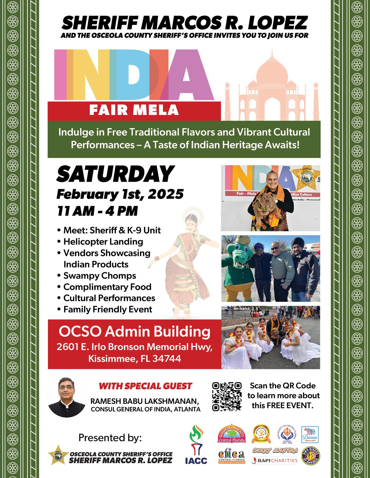 Sheriff Marcos R. Lopez and the Osceola County Sheriff’s Office invite you to the 4th Annual Happy Republic Day—INDIA Fair Mela, a Celebration of Indian Culture! We will be hosting this free event for the entire Osceola community. Join us on Saturday, February 1st, from 11:00 AM to 4:00 PM at the Osceola County Sheriff’s Office Administration building, 2601 E. Irlo Bronson Memorial Hwy, Kissimmee, FL. 34744.