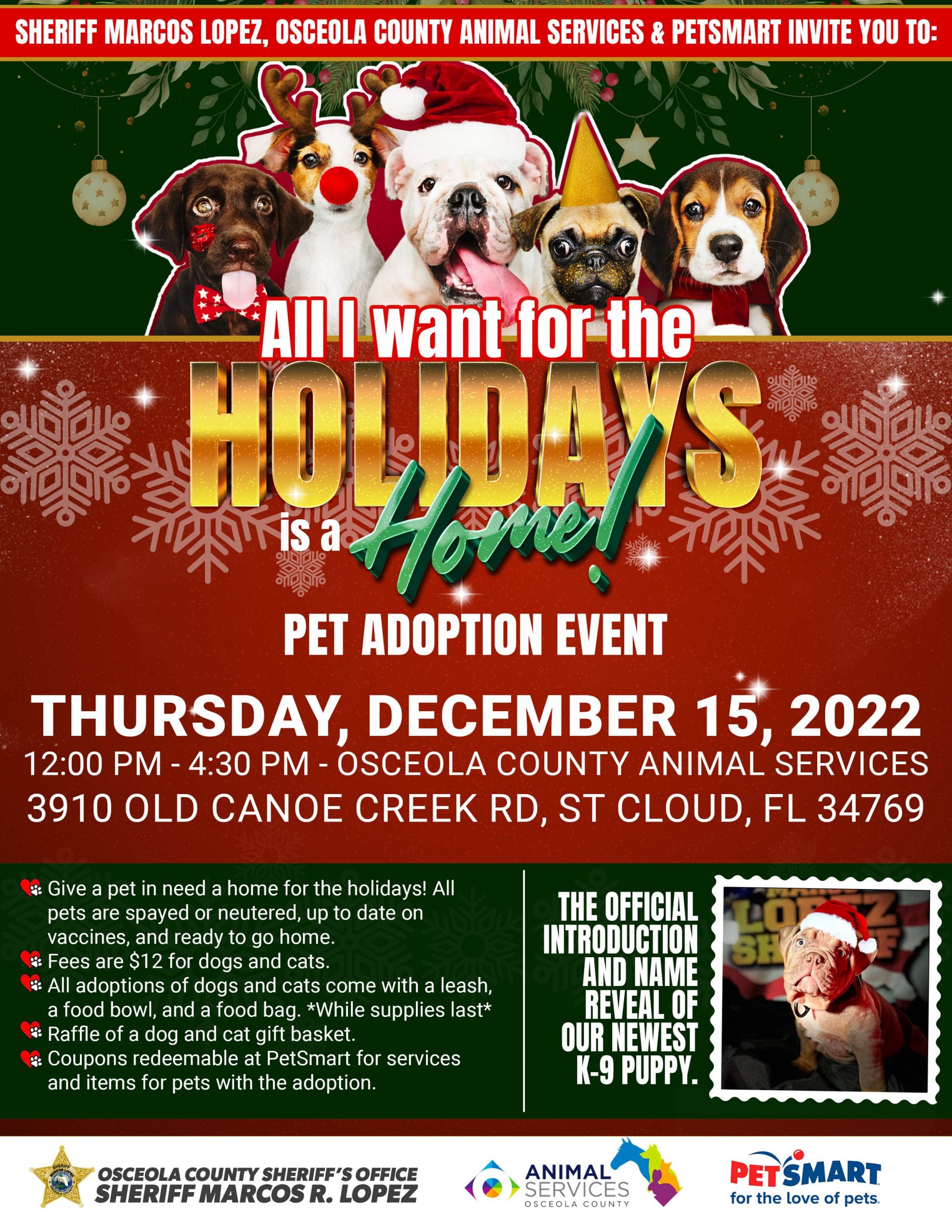 All they want for the holidays is a home. We are teaming up with Osceola County Animal Services and PetSmart for a pet adoption event. We will reveal the name of our newest K9 at this event, Don’t miss it! Please join us this Thursday, December 15, 2022, from 12:00 PM to 4:30 PM at Osceola County Animal Services, 3910 Old Canoe Cree Rd, St. Cloud, FL 34769.