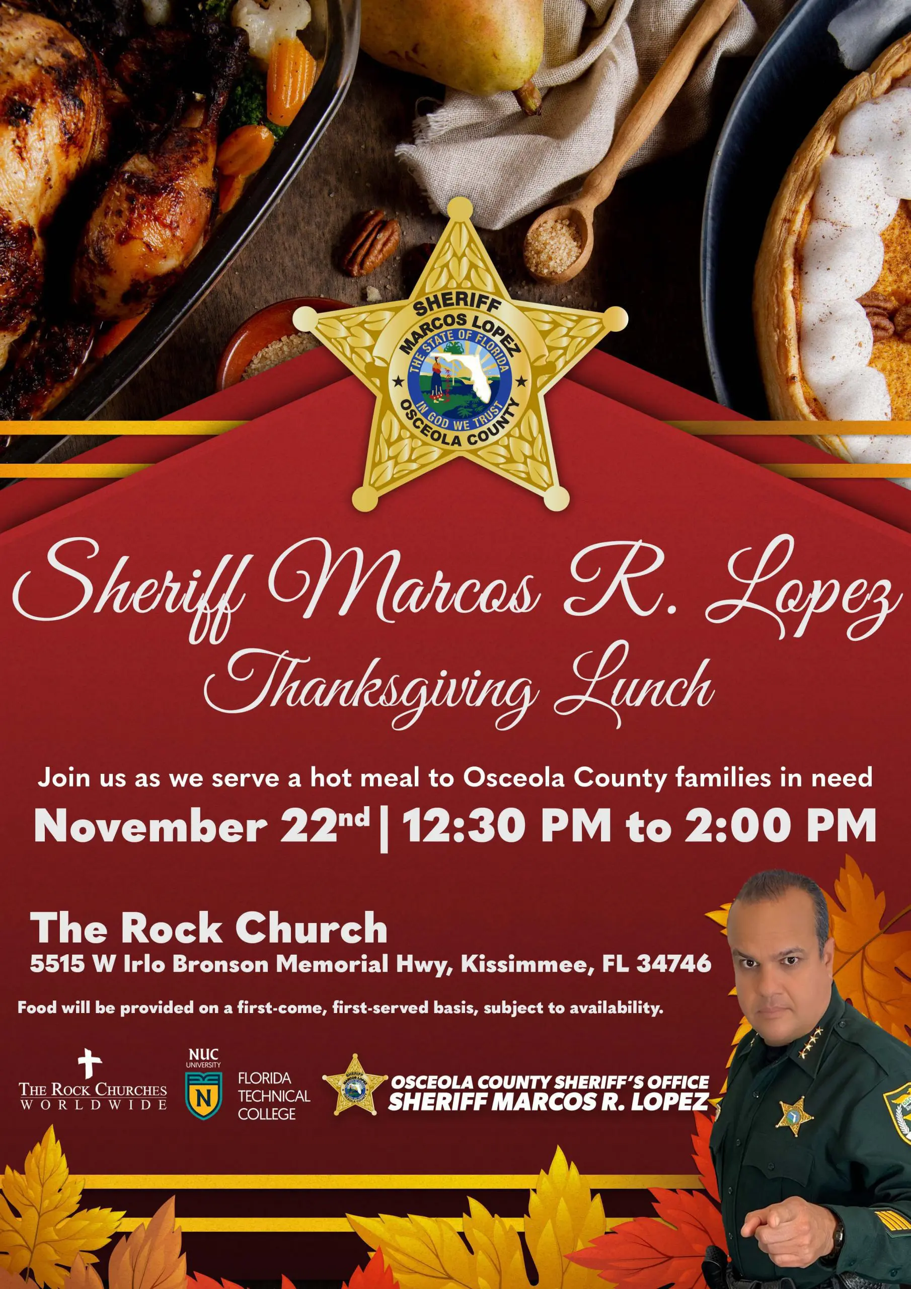Come and be a part of the heartwarming Sheriff Marcos R. Lopez Thanksgiving Lunch event! Join us as we extend a helping hand to Osceola County families in need by serving a delicious hot meal. This meaningful occasion will take place at The Rock Church, located at 5515 W Irlo Bronson Memorial Hwy, Kissimmee, FL 34746, on November 22nd, from 12:30 PM to 2:00 PM. Embracing the spirit of gratitude and community, the event aims to provide a comforting Thanksgiving experience for those facing challenging times. Food will be distributed on a first-come, first-served basis, with availability subject to demand. Let’s come together to share the joy of the season and make a positive impact on the lives of our neighbors.