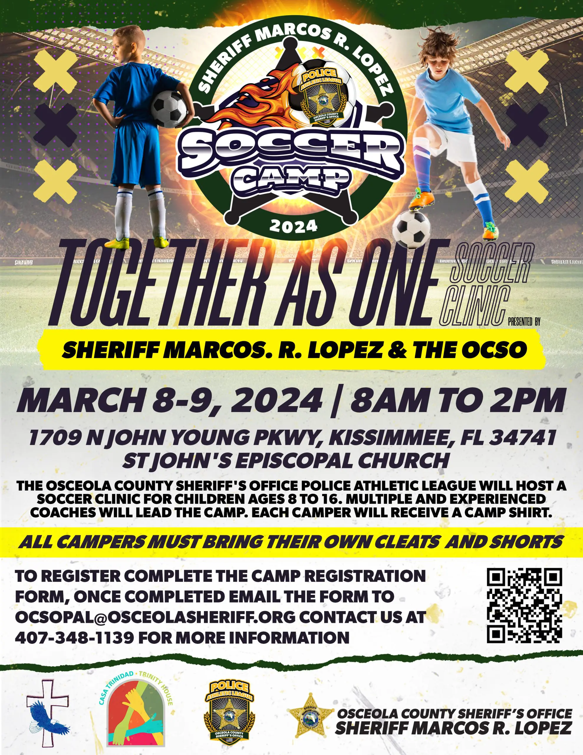 We are delighted to announce the Together As One Soccer Clinic – PAL Soccer Camp 2024, proudly presented by Sheriff Marcos R. Lopez and the Osceola County Sheriff’s Office as part of our Police Athletic League program. This exceptional event is not only an opportunity for children ages 8 to 16 to enhance their soccer skills but is also free.