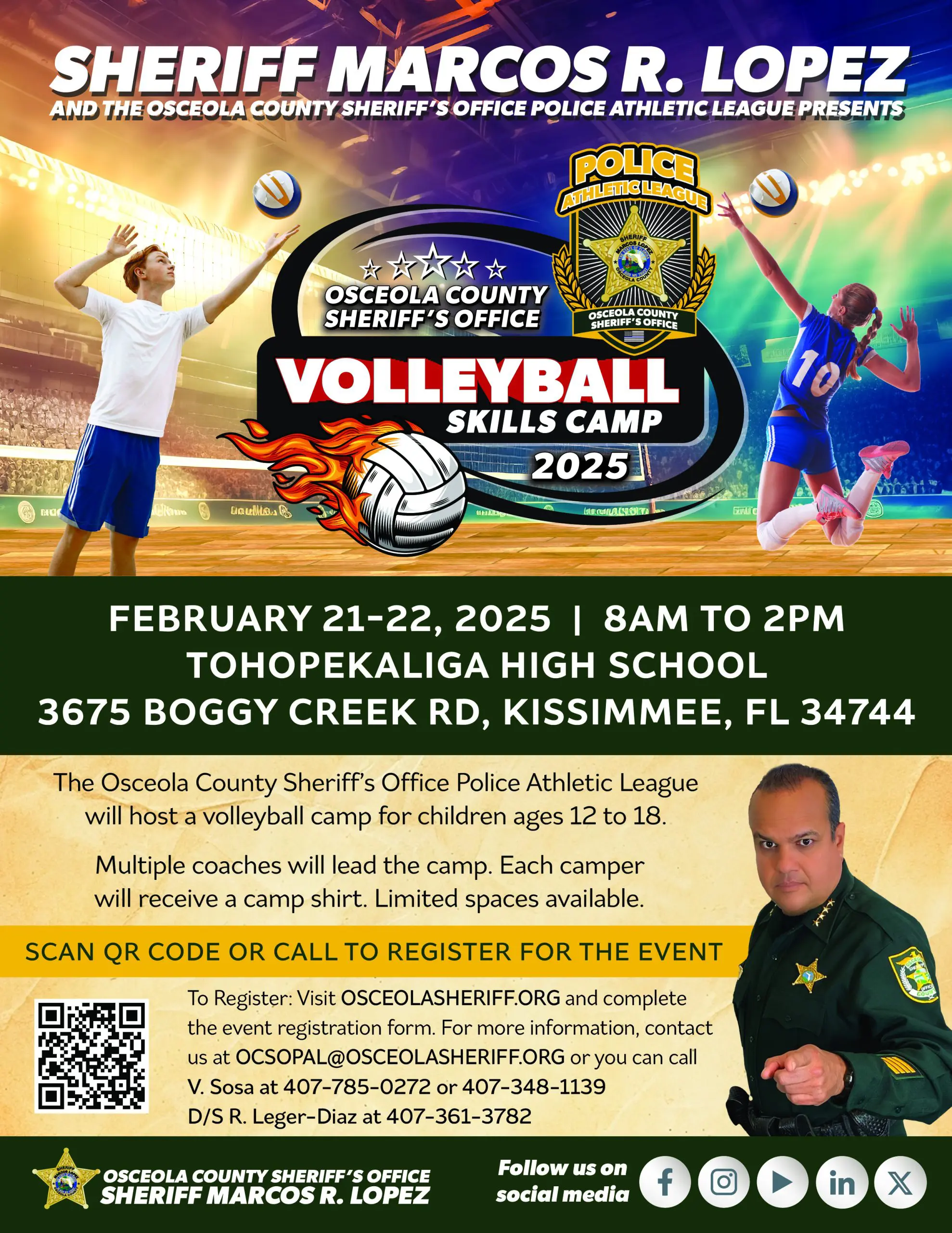 We are delighted to announce the Volleyball Skills Camp 2025, proudly presented by Sheriff Marcos R. Lopez and the Osceola County Sheriff’s Office as part of our Police Athletic League program. This exceptional event is not only an opportunity for children ages 12 to 18 to enhance their volleyball skills but is also free.