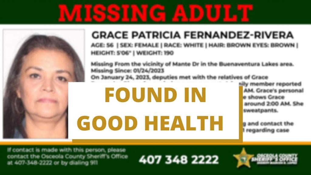Case resolved – Grace Patricia Fernandez has been found in good health.