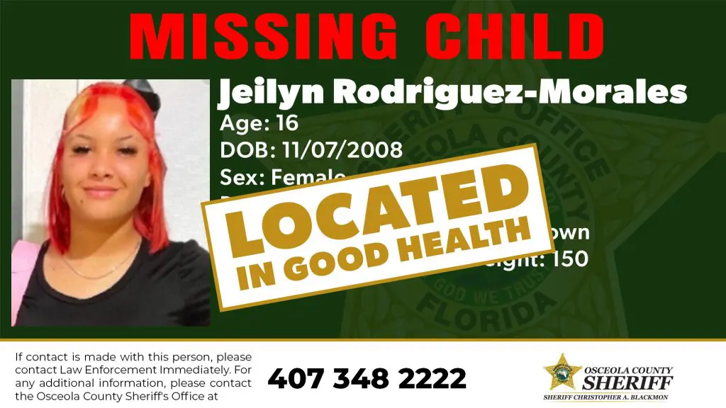 We are pleased to report that Jeilyn Rodriguez-Morales has been located and is in good health.
