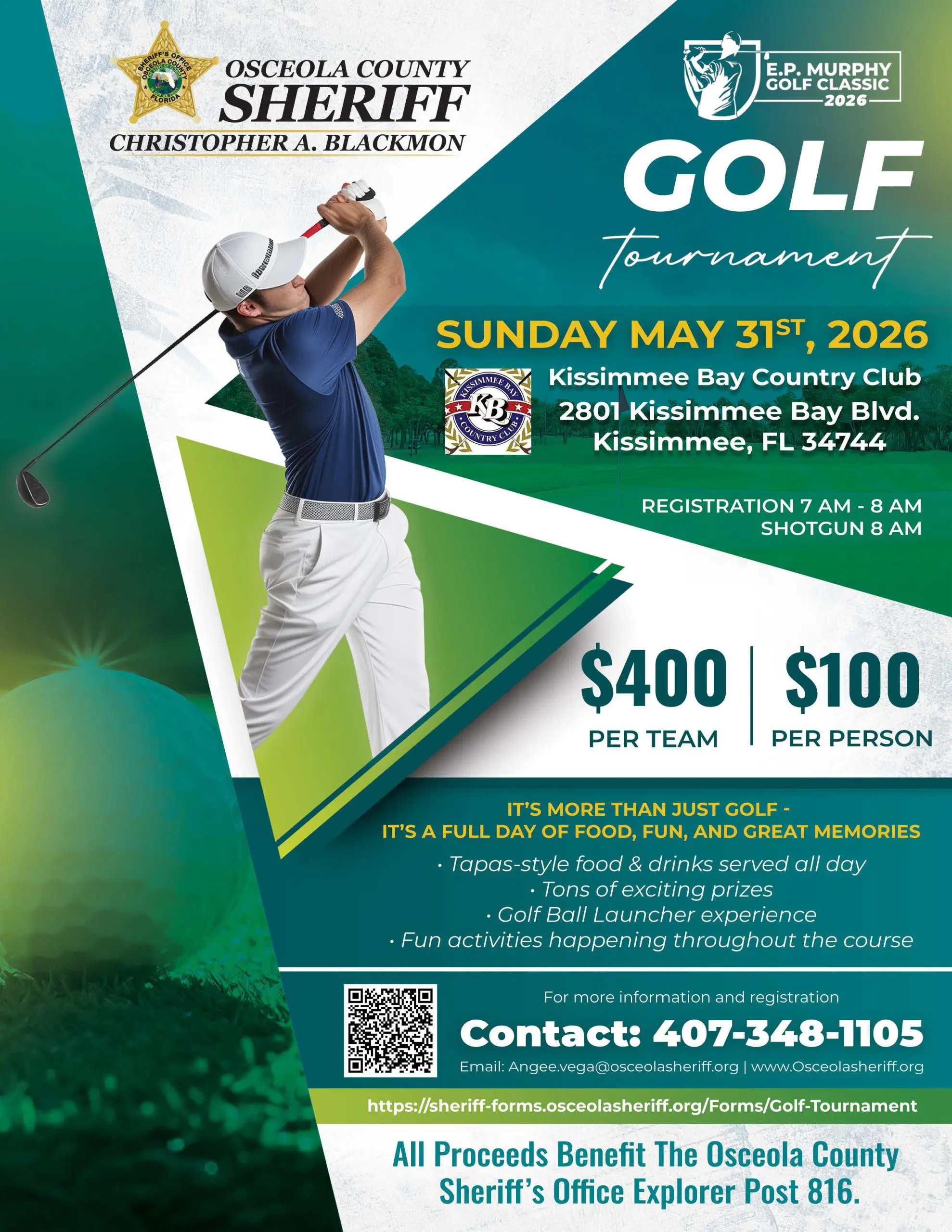 🏌️‍♂️ Join Sheriff Christopher Blackmon and the Osceola County Sheriff’s Office for the E.P. Murphy Golf Classic 2026 ⛳   Sunday, May 31, 2026 Kissimmee Bay Country Club   Enjoy a full day of golf, food, and fun, including great prizes and activities throughout the course.   Registration: 7:00 AM to 8:00 AM Shotgun Start:...