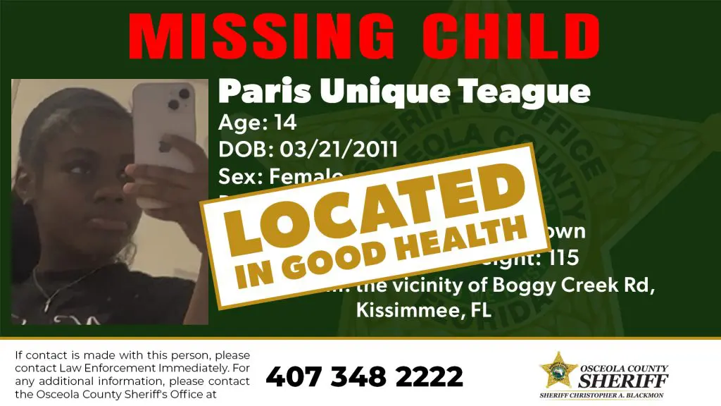 Paris Unique Teague has been located.