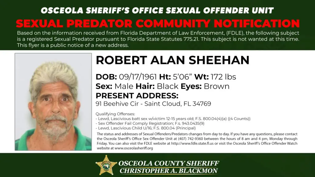 Sexual Predator Community Notification published by the Osceola County Sheriff’s Office informing residents of a registered sexual predator address update