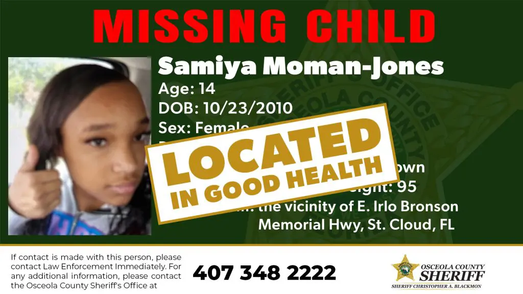 We are pleased to report that Samiya Moman-Jones has been located and is in good health.