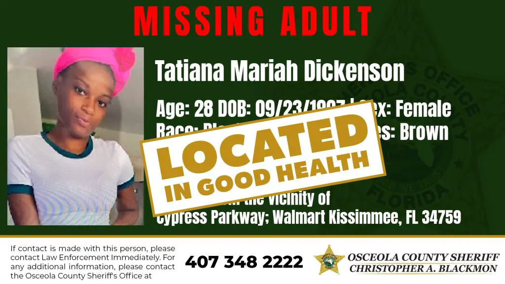 We are pleased to report that Tatiana Mariah Dickenson has been located and is in good health.